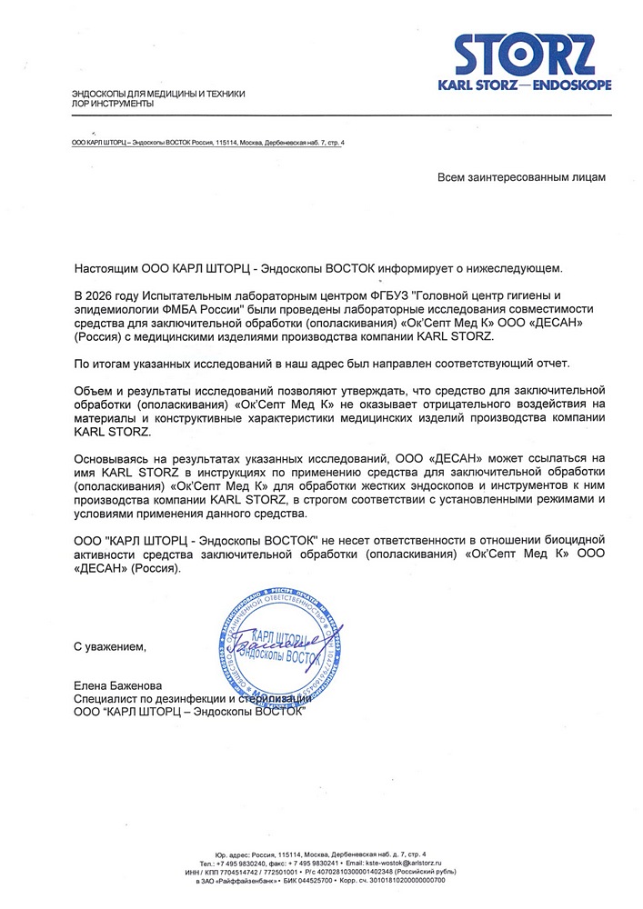 В 2026 году Испытательным лабораторным центром ФГБУЗ "Головной центр гигиены и эпидемиологии ФМБА России" были проведены лабораторные исследования совместимости средства для заключительной обработки (ополаскивания) «Ок Септ Мед К» ООО «ДЕСАН» (Россия) с медицинскими изделиями производства компании KARL STORZ.