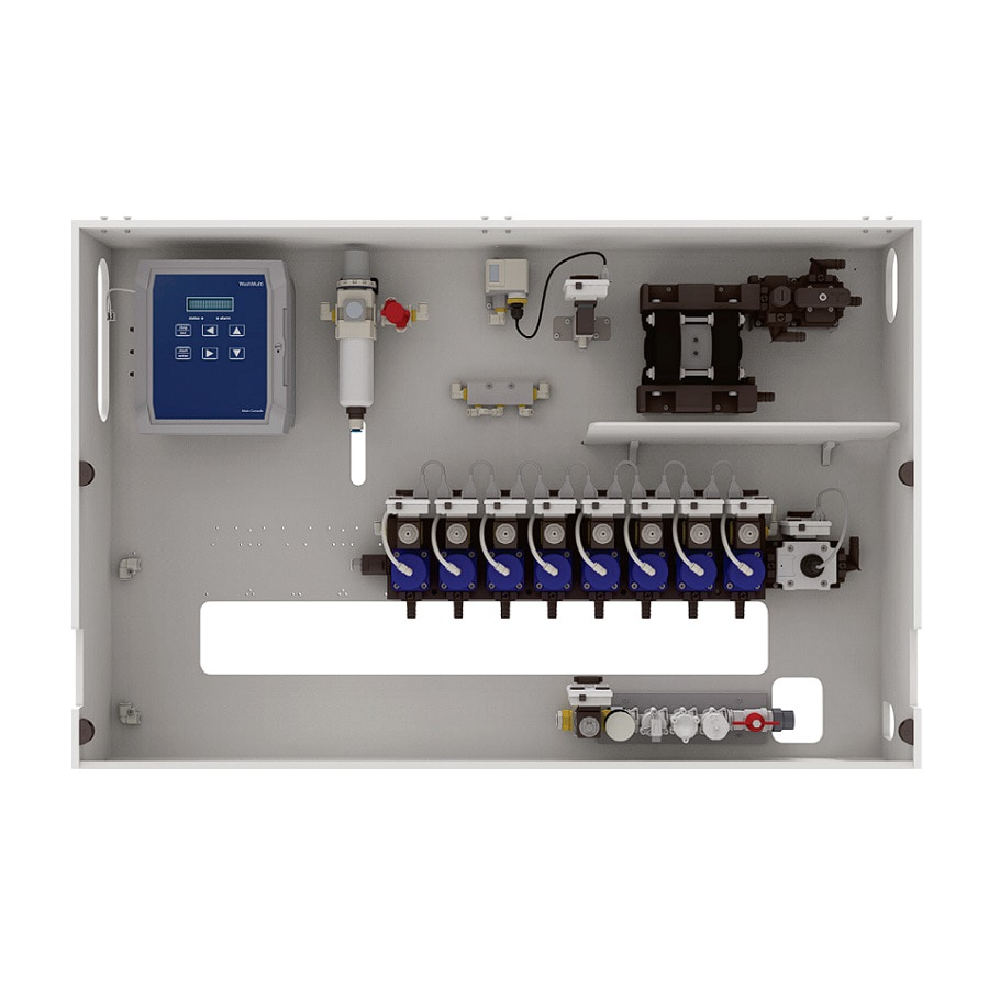 Основной блок включает 1 пневматический насос в двух разных размерах – версиях Low Flow и High Flow и 4, 6, 8, 10 или 12 пневматических всасывающих клапанов для химических средств. Для повышенной точности система WashMulti Air оснащена встроенным расходомером. Как и в случае других продуктов серии Wash, WashMulti Air обеспечивает дистанционное управление системой дозирования и предоставляет критическую для управления информацию через портал Sekoweb.
